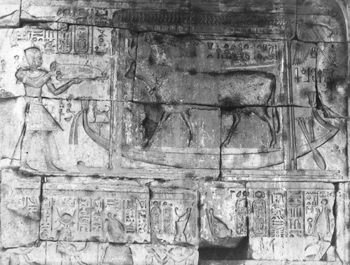 In einem kleinen Tempel befindet sich das obige Relief. Dargestellt ist eine Opferszene, bei der dem Gott Hathor, hier in Gestalt eines Rindes, geopfert wird.